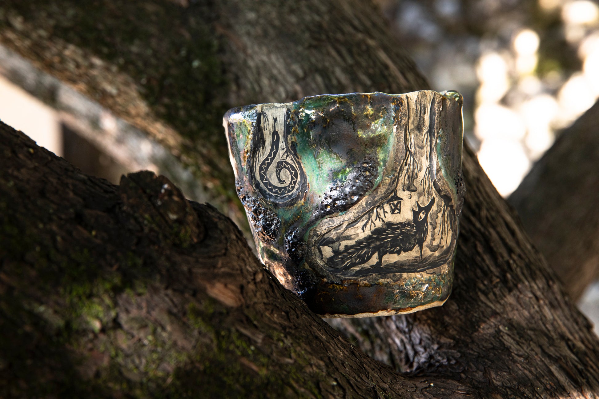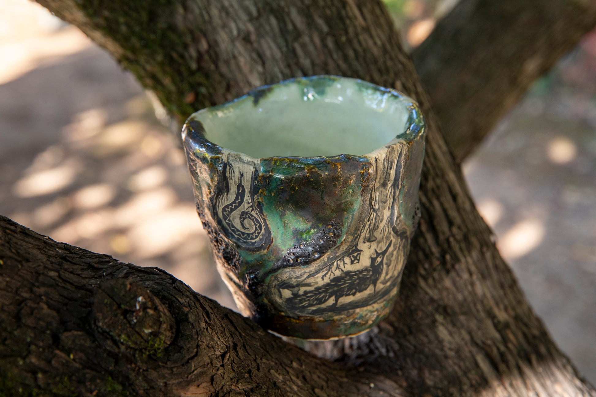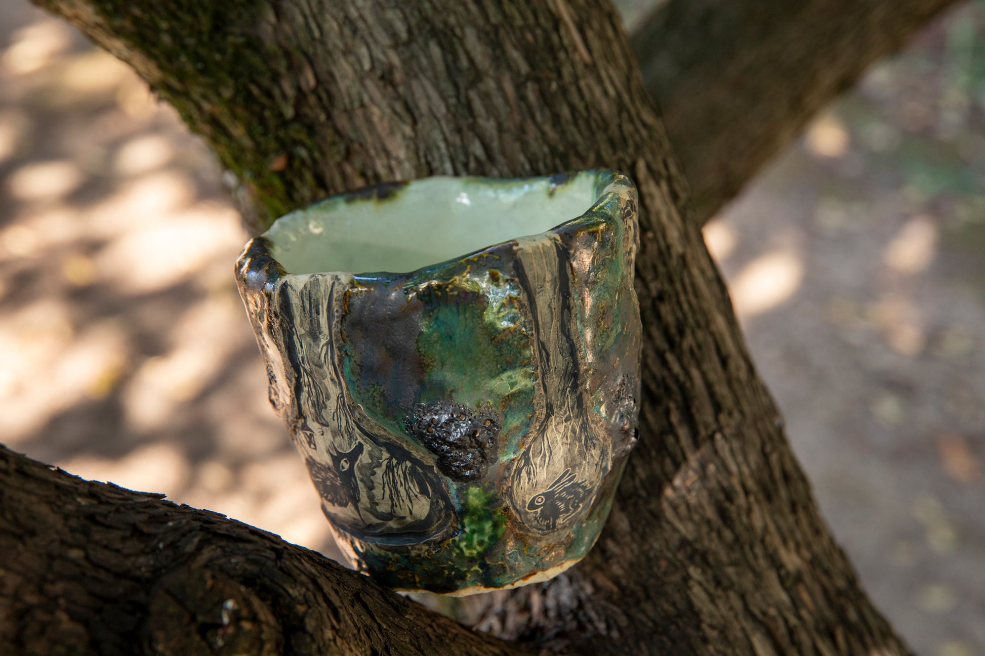 Beautiful ceramic flower planter with bear, fox, bumblebees, snake, hare, one of a kind. Cup.
