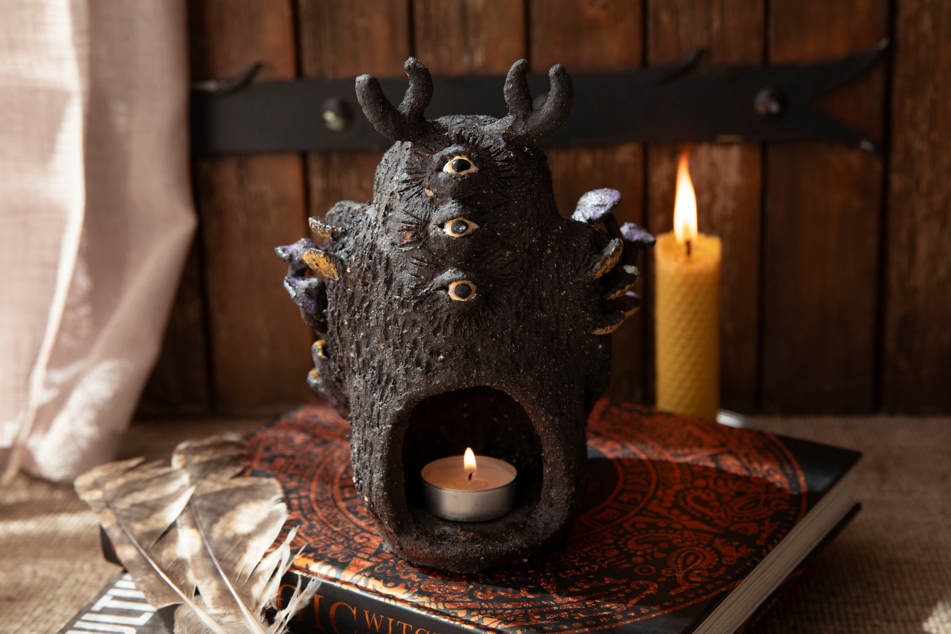 Owl candle holder, with mushrooms, and magic key, glowing in the dark, ceramic, black clay, decor